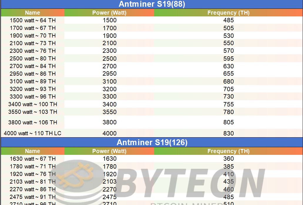 S19 series overclocking & downrclocking data reference